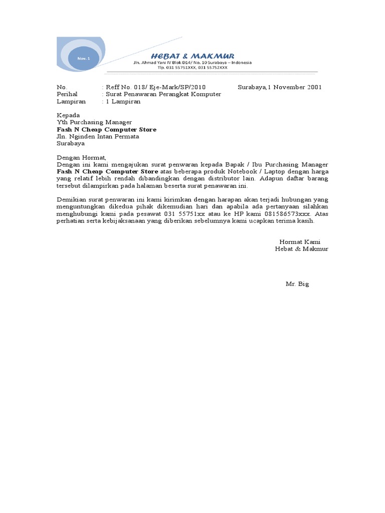 Berikut ini adalah contoh surat bentuk setengah lurus semi block style baca juga. Banyak orang yang berfikir jika pembuatan surat penawaran tidaklah. Dalam penggunaannya biasanya surat ini di pakai oleh perusahaan penyaluran misalnya distributor. Di bawah ini adalah beberapa contoh surat penawaran barang elektronik yang bisa anda pergunakan sebagai bahan referensi. Jenis surat penawaran ini seringkali dikeluarkan oleh 1.